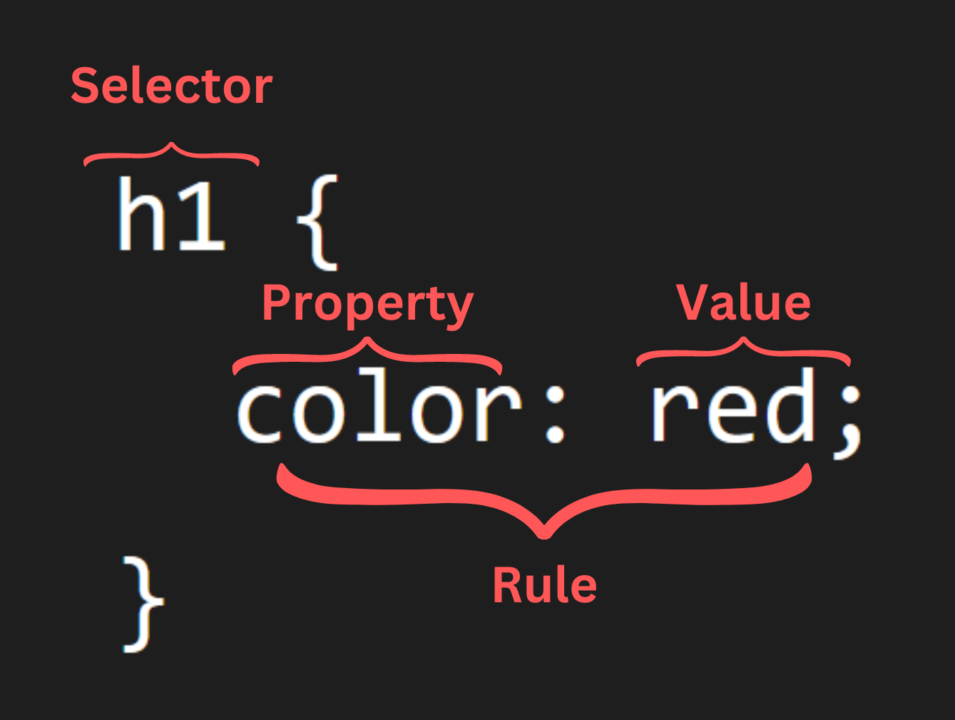 Here's an image explaining CSS's syntax, or the "grammar" for coding languages. Let's say you want to apply some CSS code to a <h1> element to make it red.